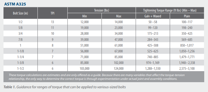 on bolt size and ranges of tightening torque for uncoated bolts and galvanized and waxed bolts.